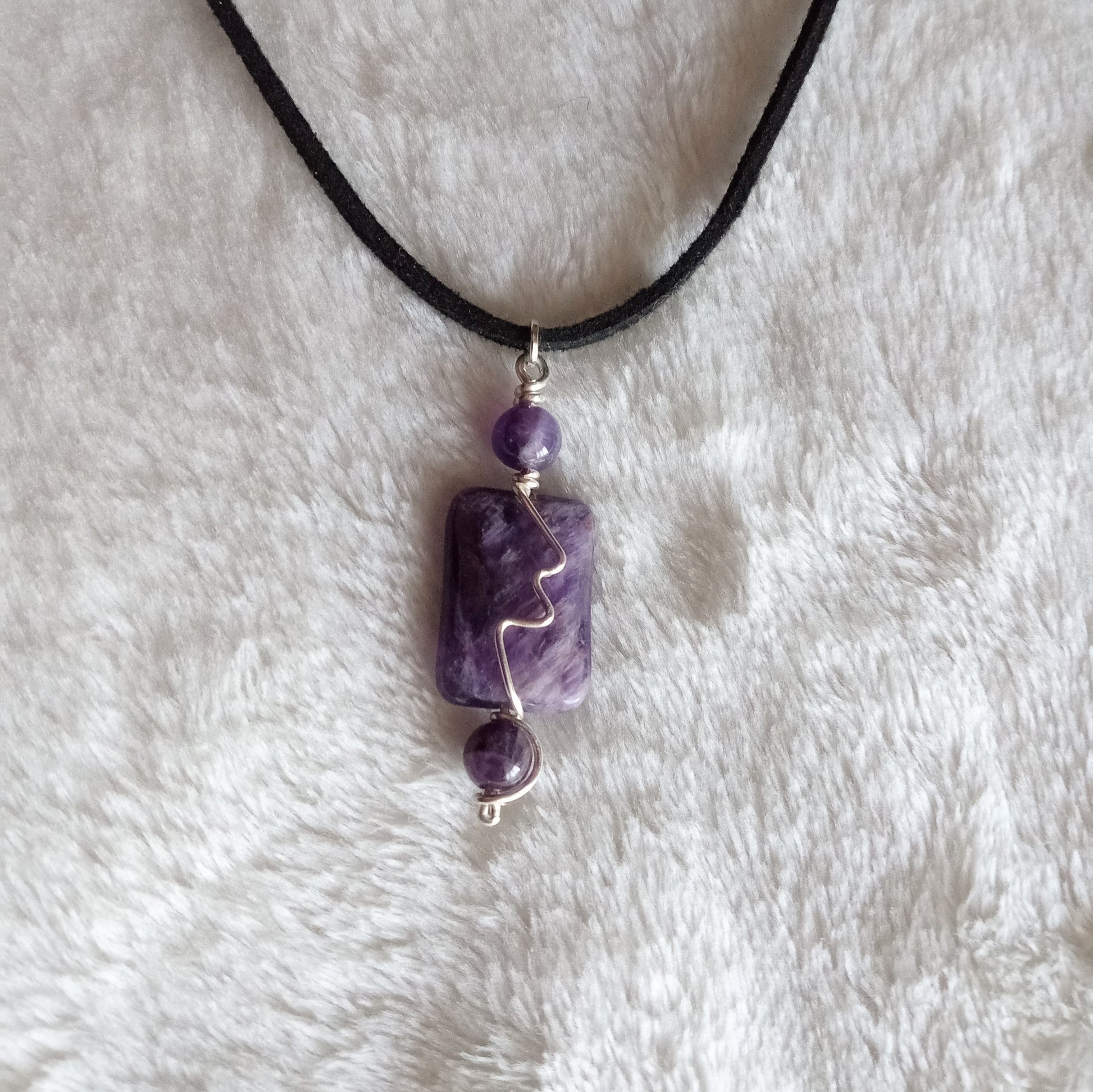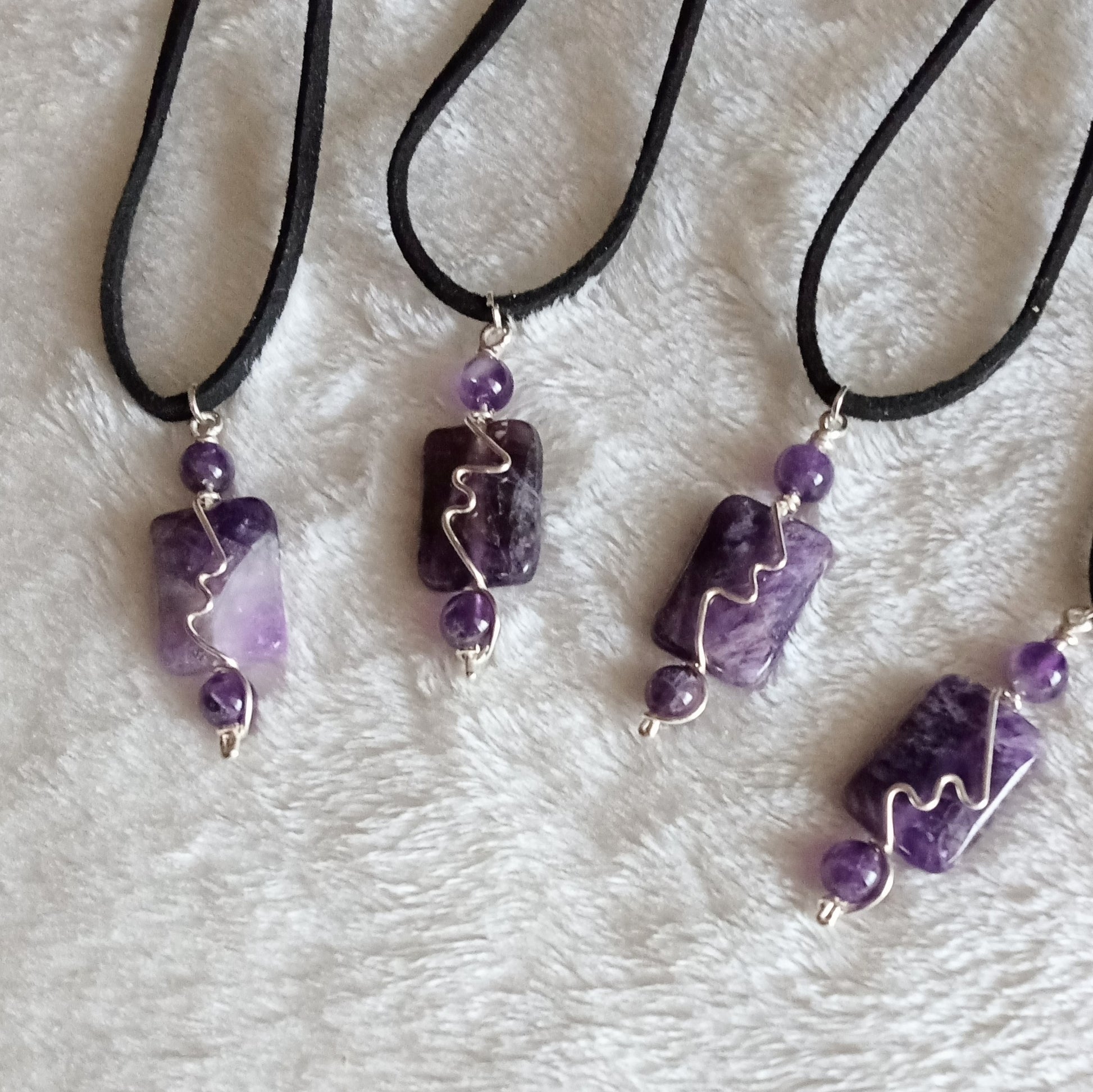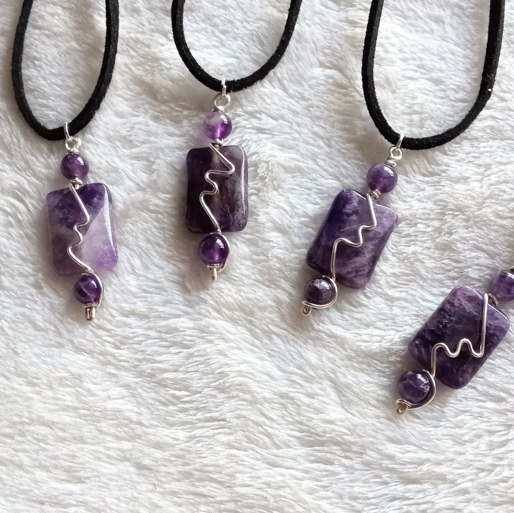 This simple wire wrapped pendant was crafted in a minimalistic design. The pendant features beautiful amethyst stones. The stones are encased in a delicate wrap of silver plated copper wire. This pendant is finished with a flexible soft sued and a length adjustable closure.