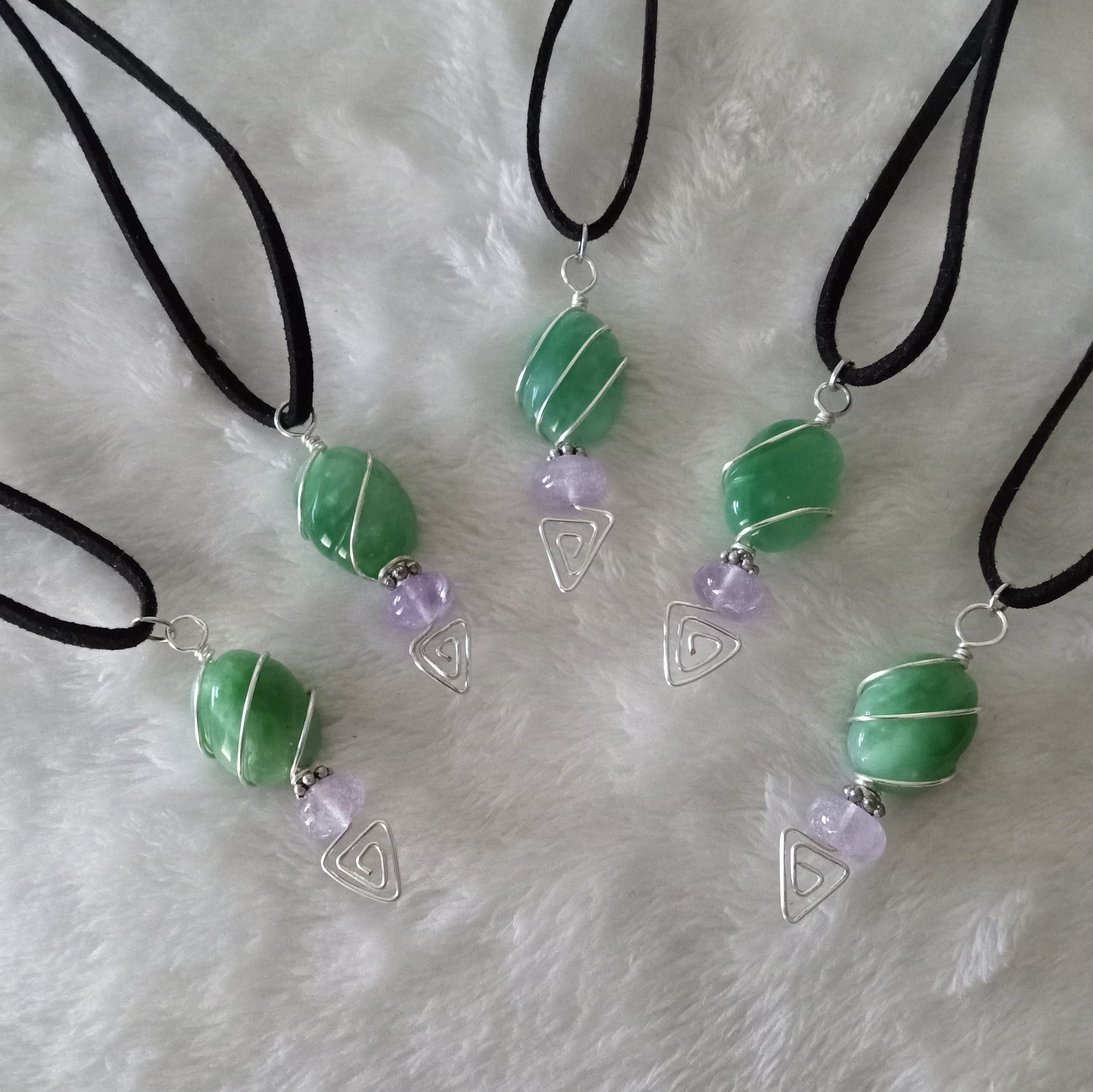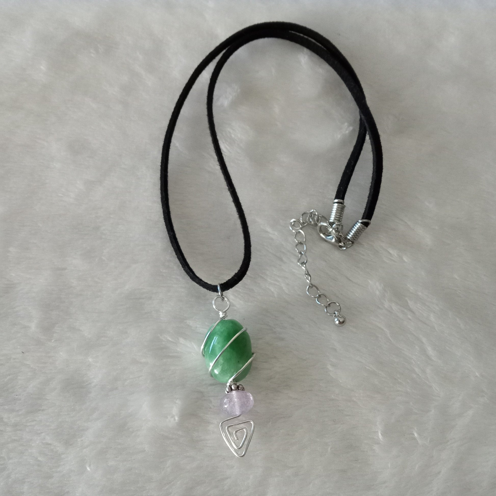 This simple wire wrapped pendant was crafted in a minimalistic design. The pendant features a stunning green aventurine carved stone and a smaller fluorite stone. The stones are encased in a delicate wrap of silver plated copper wire. This pendant is finished with a flexible soft sued and a length adjustable closure.