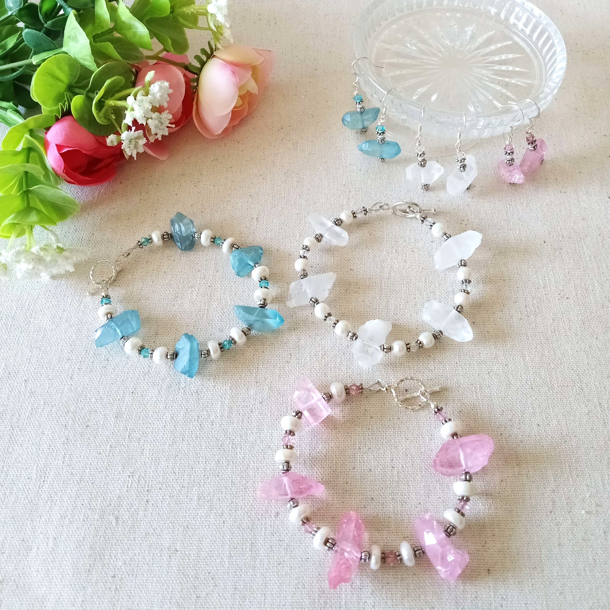 This charming bracelet is adorned with pink nuggets of quartz crystal, Swarovski crystals, and freshwater pearls, accentuated by silver beads. It is finished with silver-plated findings and sturdy beading wire. This bracelet has a delicate appearance, but is made with strong and sturdy materials.
