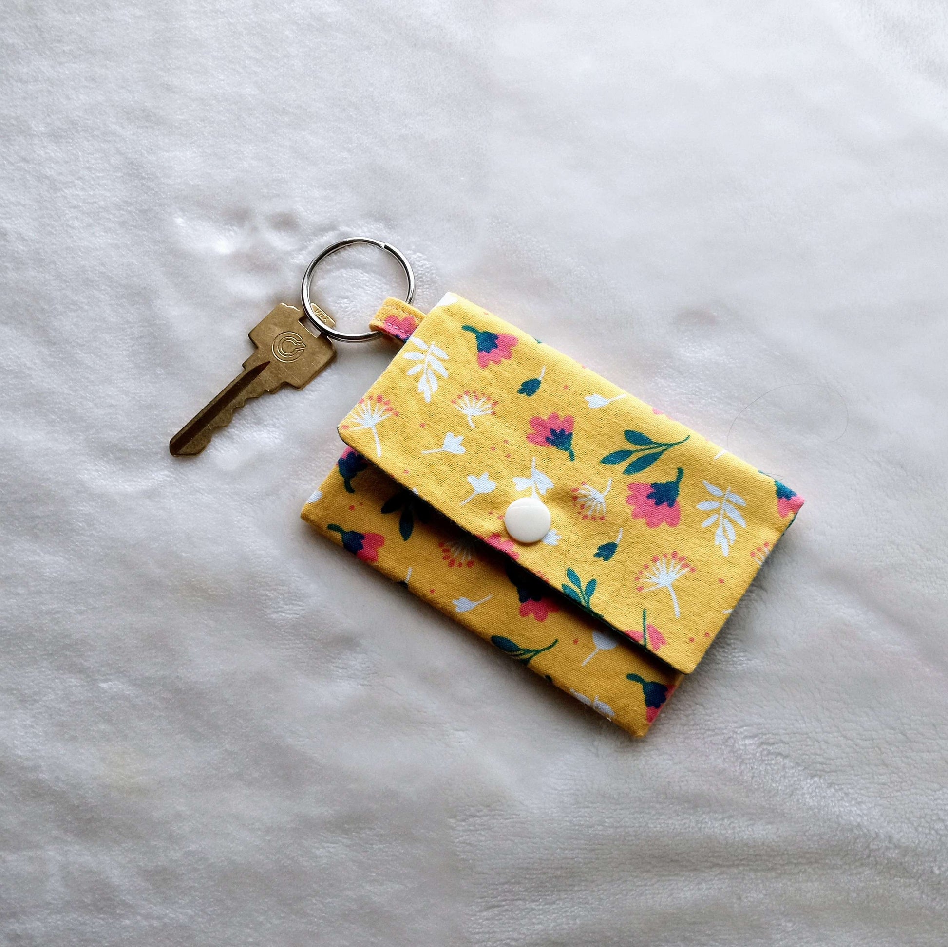 Our wallets are made from %100 cotton fabric and lined with interfacing to keep it sturdy. The wallet has three slots in total. Two of the slots are suitable for holding ID cards, credit or debit cards, and the third slot at the back is designed to contain cash bills and notes. The wallet is secured with a convenient snap closure and a durable key ring to keep all your essentials together.