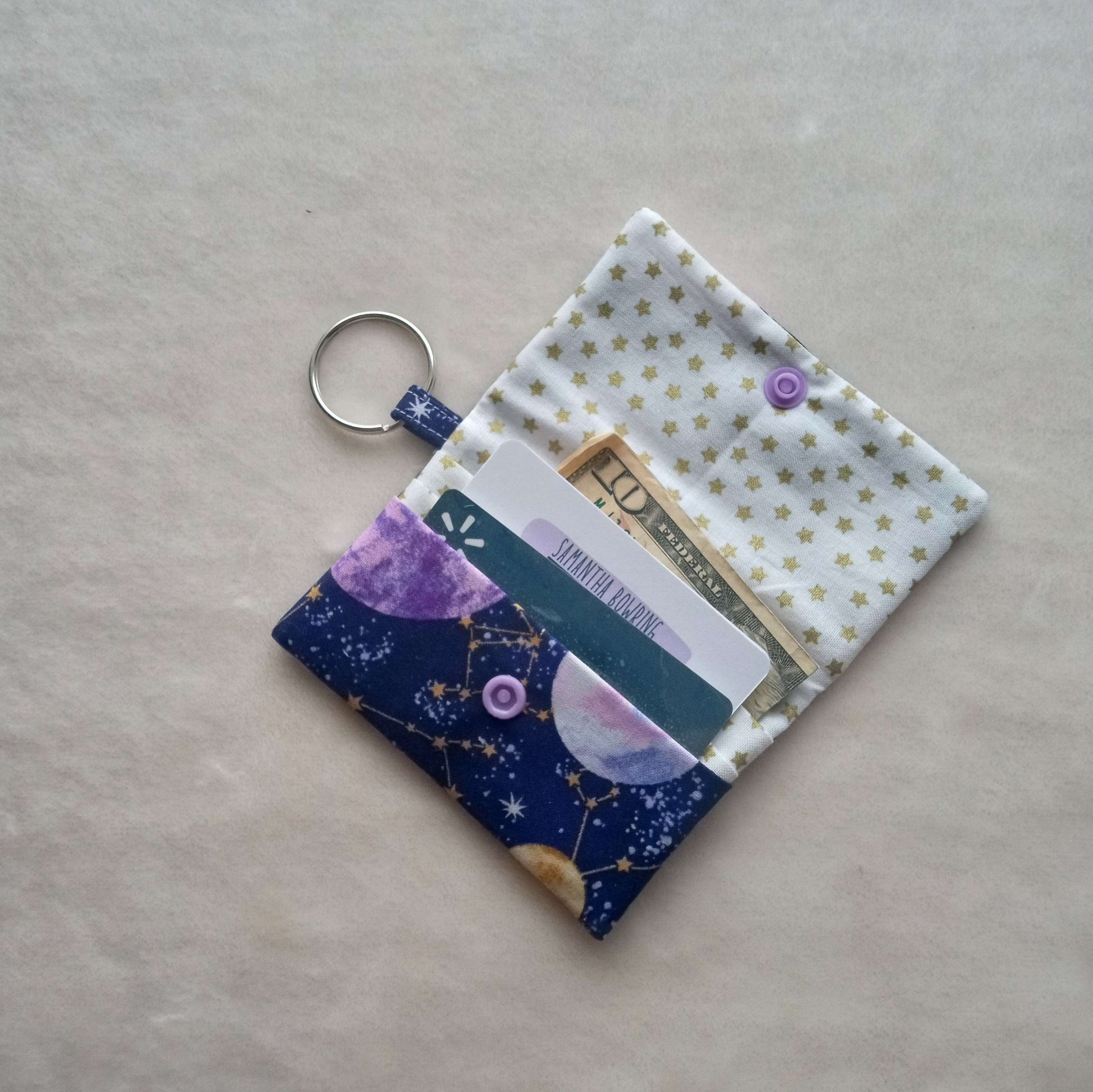 Our wallets are made from %100 cotton fabric and lined with interfacing to keep it sturdy. The wallet has three slots in total. Two of the slots are suitable for holding ID cards, credit or debit cards, and the third slot at the back is designed to contain cash bills and notes. The wallet is secured with a convenient snap closure and a durable key ring to keep all your essentials together.